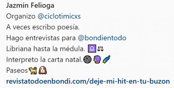 Además, dice que "a veces" escribe poesía , que organiza un ciclo de arte independiente en Buenos Aires llamado "Ciclotimicxs" y que participa haciendo entrevistas de la revista "Todo en Bondi".