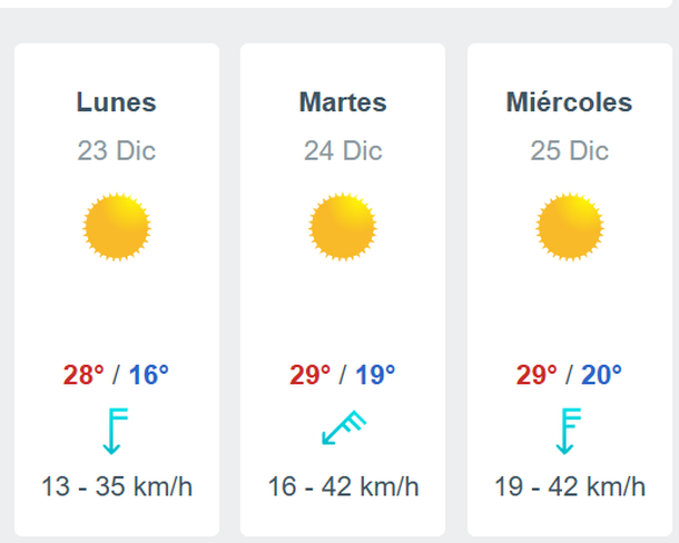En tanto, para la jornada del domingo 25 de diciembre, Navidad, se anuncia un día con marcas térmicas similares a la de la jornada anterior, con la mínima algo más elevada.