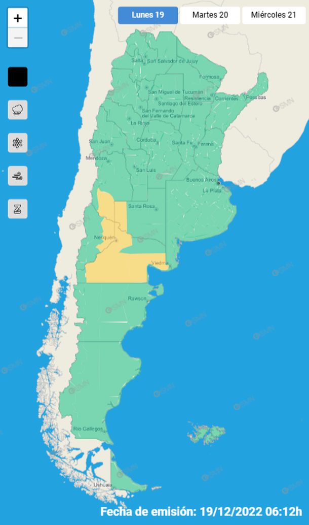 En el sudoeste de Buenos Aires, en tanto, rige alerta amarilla por temperaturas extremas en las localidades de Bahía Blanca, Coronel Pringles, Coronel Suárez, Saavedra, Tornquist, Coronel Dorrego y Monte Hermoso, entre otras, donde se prevé alcanzar los 35°C.