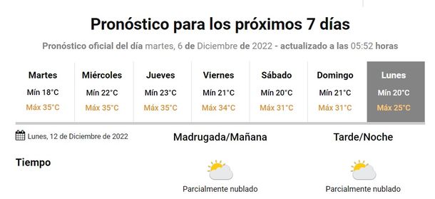 El jueves, feriado por el Día de la Virgen, se espera cielo parcialmente nublado por la mañana y despejado por la tarde, y una temperatura de 23 grados de mínima y 35 de máxima.