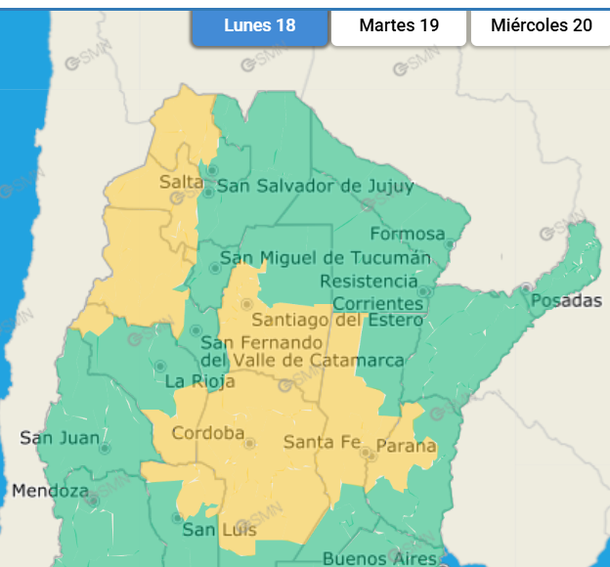 Parte de Entre Ríos, Santa Fe, San Luis y La Rioja, casi toda Córdoba y media provincia de Santiago del Estero están bajo alerta este lunes.