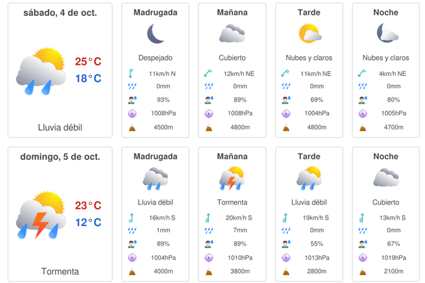 Pero no sería el único día con tormentas, porque el domingo 5 de octubre también se anuncian lluvias y en este caso serán más fuertes y se darían durante gran parte de la jornada.