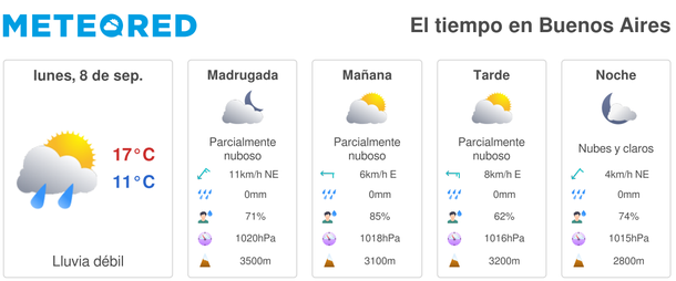 Según el sitio especializado Meteored hay chances de lluvias en la Capital Federal y el Gran Buenos Aires este mismo lunes 8 de septiembre, con tormentas sobre todo en horas de la madrugada.