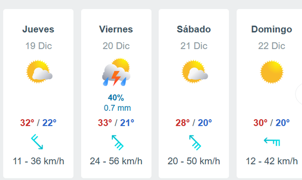 Para el martes que viene, 17 de diciembre, se anticipa cielo parcialmente nublado, con temperaturas de entre 19 y 29 grados; mientras que el miércoles tendría cielo mayormente nublado, con una mínima de 20 y una máxima de 31, en la jornada más calurosa.