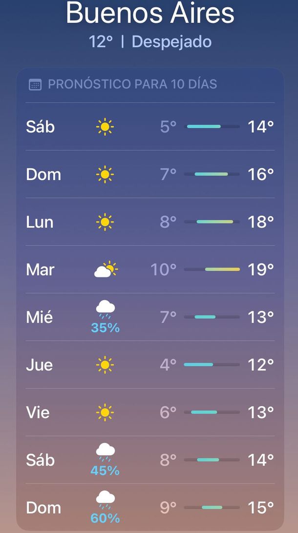 Para el inicio de la nueva semana también se espera una importante amplitud térmica en el AMBA. El lunes se anticipa con cielo algo nublado en la madrugada y mañana, pasando a parcialmente nublado en la tarde y noche; con marcas de entre 4 y 19 grados.