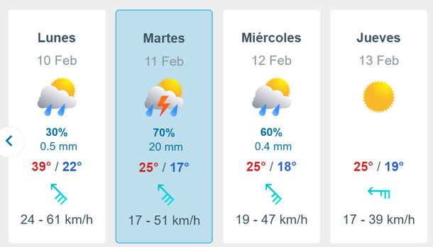 El SMN espera que las precipitaciones vuelvan este martes 4 de febrero, para cuando se mantienen las probabilidades de chaparrones en la madrugada y mañana y tormentas aisladas en la tarde y noche, con un leve descenso de las temperaturas, que rondarán entre 22 y 30 grados.