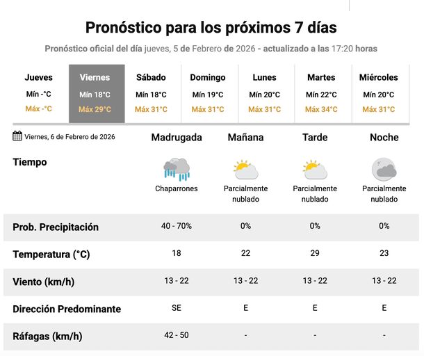 En este marco, para este jueves el Servicio Meteorológico Nacional (SMN) mantenía las probabilidades de chaparrones aislados, que podían continuar en horas de la madrugada del viernes. El cierre de la semana, desde la mañana, ya se prevé con buen clima, con cielo parcialmente nublado y temperaturas de entre 18 y 29 grados.