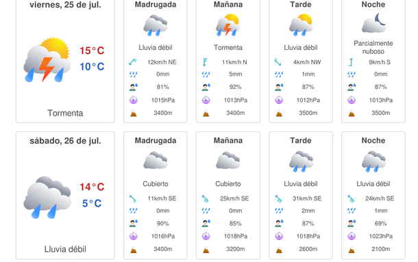 Pero no será el único día con precipitaciones, porque también se esperan lluvias para la jornada del sábado 26 de julio de 2025, con lluvias débiles en las primeras horas del día.