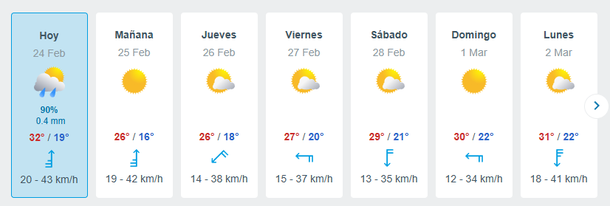 Miércoles 25: Máxima de 26° y mínima de 16°, con vientos de hasta 42 km/h.