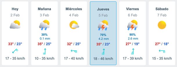 Si bien el portal especializado mantiene pronósticos de tormentas para la madrugada del viernes, el organismo nacional espera que el cierre de la semana sea con buen tiempo pero con un alivio al calor. El ingreso del frente frío haría bajar drásticamente las temperaturas, para dar lugar a una seguidilla de jornadas más templadas.