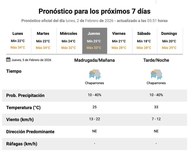 El organismo nacional prevé que la continuidad de la semana sea con calor, y que el martes tenga un tiempo similar, con cielo parcialmente nublado en la madrugada y mañana, pasando a mayormente nublado en la tarde y noche; y con temperaturas de entre 23 y 34 grados.