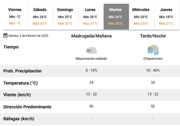 En cambio, el martes 4 el viento comenzará a soplar desde el Sudeste, con una máxima de 33 grados y la probabilidad de chaparrones para la tarde-noche. Asimismo, el miércoles 5 también se esperan chaparrones y lluvias, con un nuevo cambio de dirección del viento: soplará desde el Este.