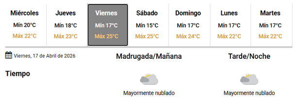 Para el viernes, se espera una marcada mejora en las condiciones climáticas: las temperaturas oscilarán entre los 17 y 25 grados, con cielo mayormente nublado y viento soplando desde el Sur. En esta jornada, no hay probabilidad de lluvias ni tormentas.