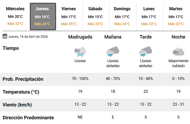 En lo que respecta a las temperaturas, el termómetro de este jueves oscilará entre los 18 y 23 grados. En tanto, el viento sufrirá un fuerte cambio: soplará inicialmente desde el Noreste y el Este, para luego hacerlo desde el Sur, en el ocaso de la jornada.