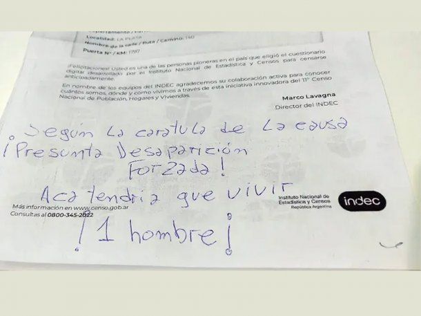 "Según la carátula de la causa, 'Presunta desaparición forzada'. ¡Acá tendría que vivir un hombre!", expresa el escrito sobre el papel del Censo pegado en la puerta.