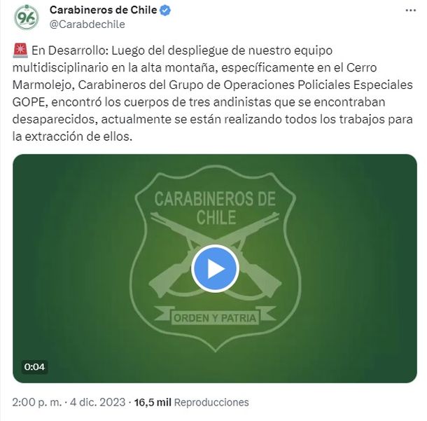 Carabineros de Chile confirmó el triste hallazgo en las redes sociales: "Luego del despliegue de nuestro equipo multidisciplinario en la alta montaña, específicamente en el Cerro Marmolejo, Carabineros del Grupo de Operaciones Policiales Especiales GOPE, encontró los cuerpos de tres andinistas que se encontraban desaparecidos, actualmente se están realizando todos los trabajos para la extracción de ellos".