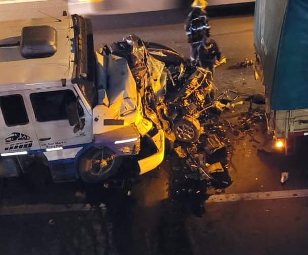 A las 6, cuando la autopista Panamericana todavía se encontraba con dos carriles reducidos por ese accidente, se produjo un choque múltiple entre cuatro camiones y un auto que quedó aplastado entre dos de ellos.