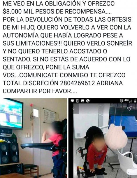 La madre de un niño de cinco años con problemas de movilidad ofrece en redes sociales ocho mil pesos para recuperar una prótesis que le robaron delincuentes que ingresaron a su casa de la ciudad de Trelew, en la provincia de Chubut.