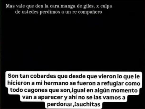 “Son tan cobardes que desde que vieron lo que le hicieron a mi hermano se fueron a refugiar como los cagones que son. Igual en algún momento van a aparecer y ahí no se las vamos a perdonar, lauchitas”, dice una de las historias publicadas en Instagram.