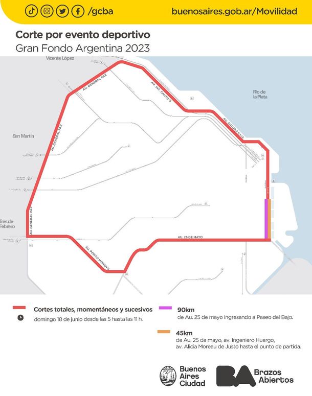 - Cortes totales, momentáneos y sucesivos desde av. Alicia Moreau de Justo entre Azucena Villaflor y Macacha Güemes, por av. Alicia Moreau de Justo, av. Antártida Argentina, ingreso de emergencia a Paseo del Bajo, Paseo Del Bajo (sentidoRetiro), continuando por AU. Illia (sentido Gral. Paz), AU. Int. Cantilo, av. Gral. Paz, enlace Acceso Oeste, AU. Perito Moreno, AU. 25 de Mayo, AU. Ricardo Balbín, Paseo del Bajo, repitiendo dicho recorrido dos veces, saliendo hacia av. Ing. Huergo, Cochabamba, av Alicia Moreau de Justo, hasta el punto de partida. Horario: domingo 18 de junio de 06.30 h a 11 h