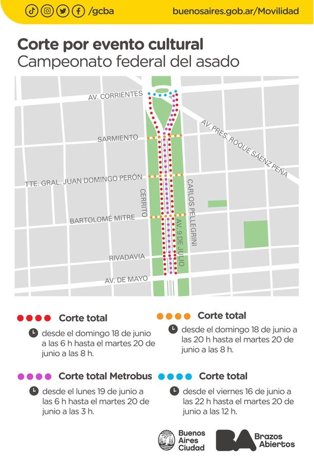 - Corte total en av. Corrientes Sur entre ramales centrales de av. 9 de Julio. Horario: desde el viernes 16 de junio a las 22 h hasta el martes 20 de junio a las 12 h. Corte total en av. Rivadavia entre av. 9 de Julio Norte y Sur.