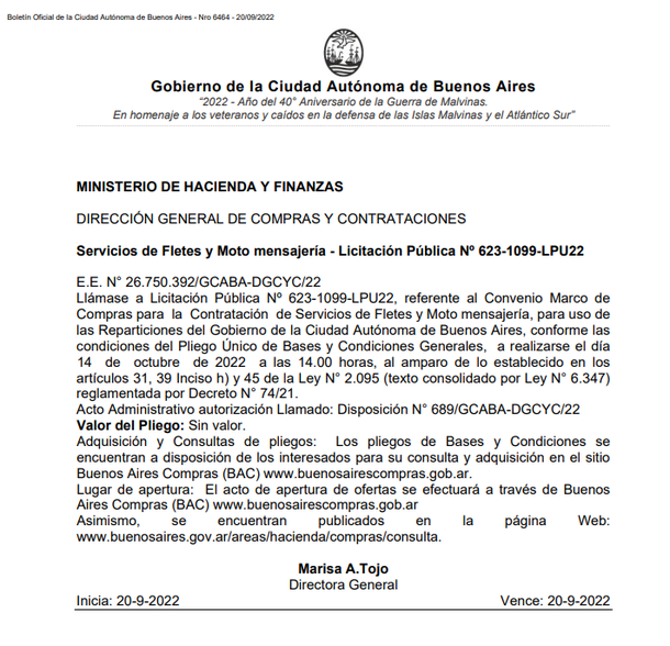 "Llámase a Licitación Pública Nº 623-1099-LPU22, referente al Convenio Marco de Compras para la Contratación de Servicios de Fletes y Moto mensajería, para uso de las Reparticiones del Gobierno de la Ciudad Autónoma de Buenos Aires, conforme las condiciones del Pliego Único de Bases y Condiciones Generales, a realizarse el día 14 de octubre de 2022 a las 14.00 horas, al amparo de lo establecido en los artículos 31, 39 Inciso h) y 45 de la Ley N° 2.095 (texto consolidado por Ley N° 6.347) reglamentada por Decreto N° 74/21", indica la resolución publicada en el Boletín Oficial porteño.