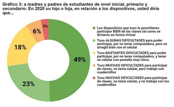 También es importante observar que la mayoría de las madres y padres manifiesta que sus hijos/as no experimentaron graves dificultades a la hora de conectarse a las clases virtuales (de forma muy similar opinaron los/as estudiantes de los últimos años del secundario que respondieron la encuesta, según su experiencia personal). En este sentido, como puede verse en el gráfico 3, el 49% escogió la respuesta “los dispositivos que tuvo le permitieron participar BIEN de las clases tal como se dictaron en forma virtual”, y un 23% optó por “tuvo ALGUNAS DIFICULTADES para poder participar, por no tener computadora, pero se arregló bien con el celular”. Un 18% planteó que su hijo o hija tuvo bastantes dificultades, un 6% muchas dificultades para conectarse y un 3% que las resolvió con los cuadernillos impresos. Al interpretar estos porcentajes, no debemos olvidar que esta encuesta fue administrada a través de internet, invitando aleatoriamente a usuarios de Facebook para que la respondieran. Si bien se han realizado ponderaciones para adecuar la cantidad de casos según los niveles de educación de los datos censales, es muy probable que los sectores cuyos hijos tuvieron los más graves problemas de conectividad durante el 2020, estén subrepresentados en nuestra encuesta.