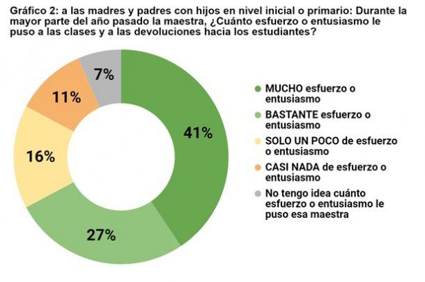 Si preguntamos por el esfuerzo o entusiasmo que pusieron esas mismas maestras en dar sus clases y en realizar la devoluciones a sus hijos/as, los resultados también son significativamente altos, como se puede ver en el gráfico 2.