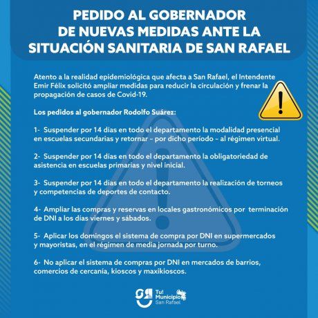 - Suspender por 14 días en todo el departamento de San Rafael la modalidad presencial en escuelas secundarias y retornar - por dicho período - al régimen de educación virtual.