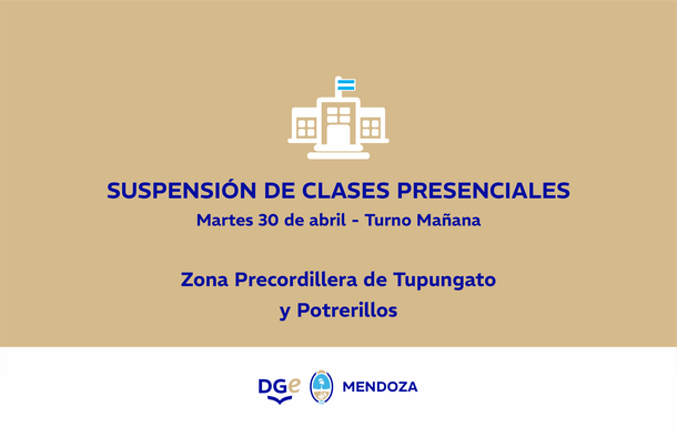 "Debido a los registros meteorológicos que confirman ráfagas de viento Zonda, y siguiendo las recomendaciones de la Dirección de Defensa Civil, la Dirección General de Escuelas (DGE) informa que este martes 30 de abril continúa la suspensión de clases presenciales en el turno mañana en las escuelas de todos los niveles y modalidades en los precordillera de Tupungato y Potrerillos.