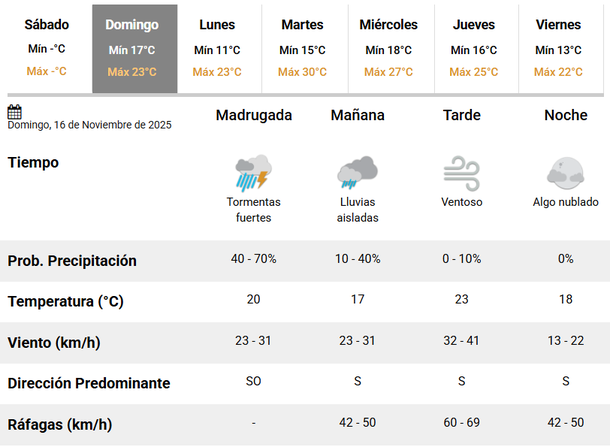 Si bien el lunes ya no habrá lluvias ni tormentas, el SMN anticipó que las térmicas serán similares al domingo: la mínima rondará los 11 grados, mientras que la máxima ascenderá a 23. La jornada presentará un cielo despejado con viento desde el Oeste, aunque podrían llegar algunas ráfagas del Noroeste hacia la noche.