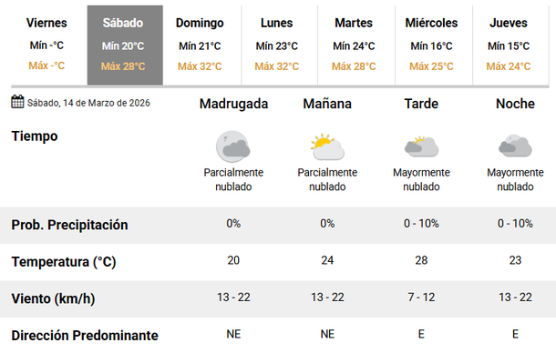 De acuerdo a lo informado por el Servicio Meteorológico Nacional (SMN), el termómetro oscilará entre los 20 y 28 grados, con cielo parcialmente nublado durante la mañana y mayormente nublado hacia la tarde. No se esperan precipitaciones, al menos, por el momento.