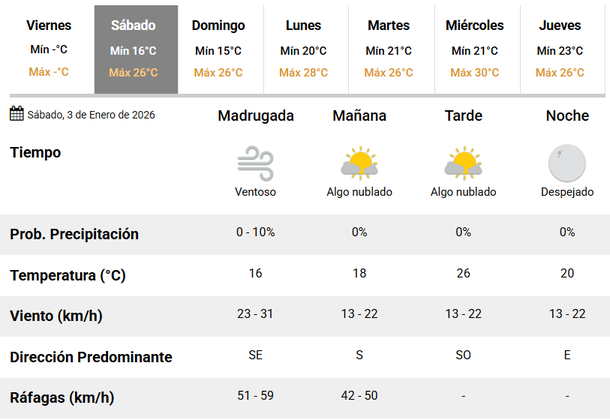 Si bien durante la madrugada estará ventoso, durante la mañana y la tarde el cielo se presentará algo nublado, mientras que a la noche se despejará. El viento soplará desde el Sur, virando hacia el Este en las últimas horas de la jornada.