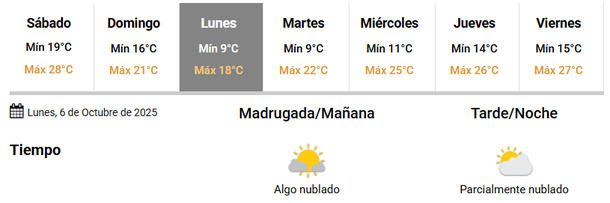 Con una mínima de 9 grados y una máxima de 18, el clima del lunes se presentará algo más fresco que lo que ha sido esta semana. El viento soplará predominantemente del sector Sur, por lo que será un viento frío, pero el cielo permanecerá algo nublado, dejando salir y brillar al sol.