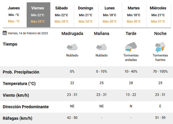 El sábado continuará el mal clima con tormentas aisladas por la madrugada y la mañana. La temperatura, en tanto, será idéntida al viernes: 22 grados de mínima y 28 de máxima, con viento soplando del Noroeste hacia el final del día.