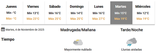 El cielo estará de parcial a mayormente nublado, con viento predominante del sector Oeste y sin posibilidades de precipitaciones.