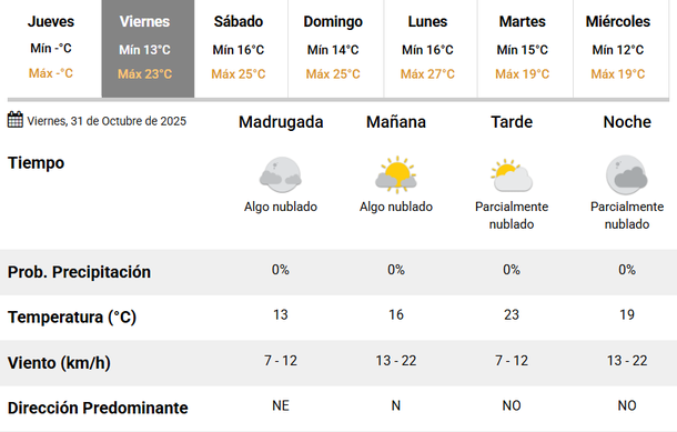 Por su parte, el domingo también será una jornada climáticamente óptima: el termómetro irá desde los 14 a los 25 grados, con cielo parcialmente nublado y viento soplando del Noroeste durante la mañana, para luego hacerlo desde el Noreste hacia la noche.