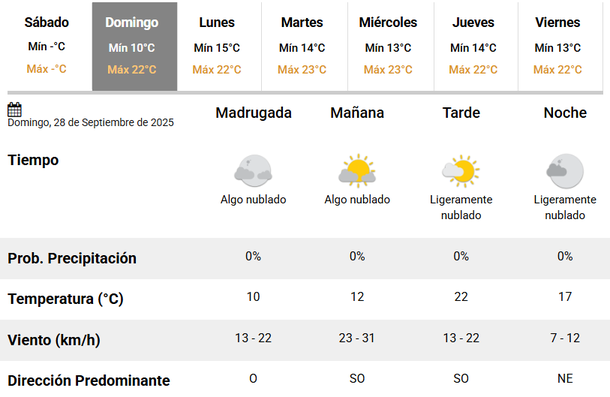 Para el martes, se esperan térmicas que vayan desde los 14 a los 23 grados, con cielo mayormente nublado durante la mañana y algo nublado hacia la tarde/noche. Tampoco se anticipan precipitaciones para el segundo día de la próxima semana, aunque sí hay que destacar que el viento pasará a soplar desde el Sur.