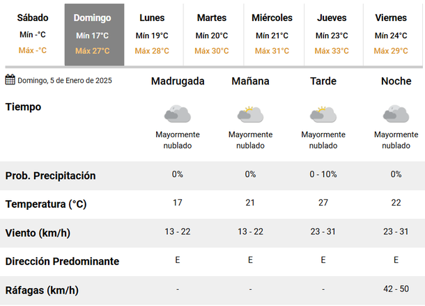 El cielo permanecerá mayormente nublado durante toda la jornada, mientras que la dirección predominante del viento será el Este. No se esperan precipitaciones, pero sí ráfagas de hasta 50 kilómetros por hora al cierre del día.