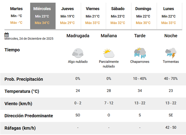 La jornada navideña se vivirá con algo de alivio en lo que a térmicas respecta: este jueves amanecerá con tormentas aisladas y ráfagas de hasta 60 kilómetros por hora, provenientes del Sudeste, lo que se traducirá en una mañana fresca de Navidad. Las temperaturas de este 25 de diciembre oscilarán entre los 19 y 29 grados.