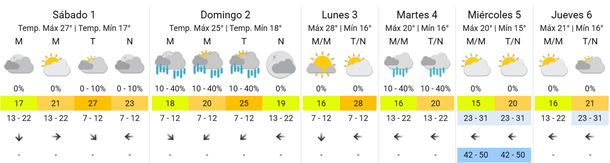 El domingo, en tanto, será un día mayormente pasado por agua: desde la mañana y hasta la tarde-noche se prevé hasta 40% de probabilidad de chaparrones aislados, además de un leve descenso de la temperatura máxima, que alcanzará los 25°.