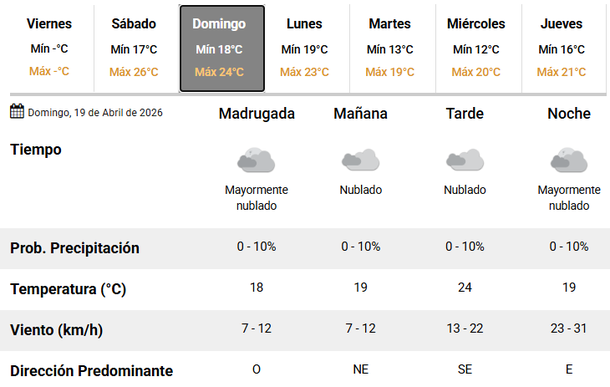 De la misma manera, el domingo mantendrá temperaturas agradables, aunque poco a poco crecerá la nubosidad, como antesala a un lunes complicado. De hecho, el organismo señala que el cielo dominical estará completamente nublado y con varios cambios en la dirección del viento.