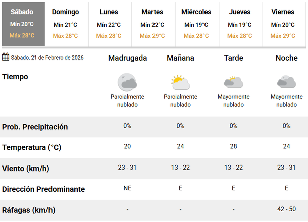 En tanto, el cielo permanecerá parcialmente nublado y, hacia la noche, se tornará mayormente nublado, con ráfagas de hasta 50 kilómetros por hora provenientes del Este.