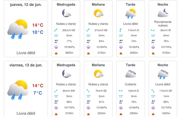 Para la jornada del jueves las lluvias se esperan por la tarde, mientras que el viernes 14 de junio serían hacia la tarde-noche, según las previsiones de los meteorólogos.