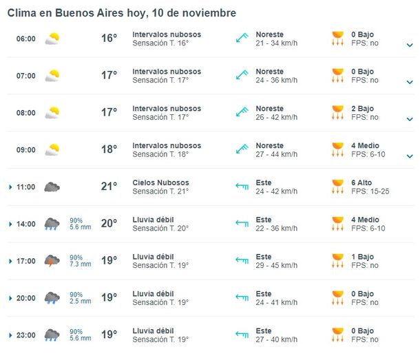 A qué hora llueve hoy viernes 10 de noviembre en la ciudad de Buenos Aires