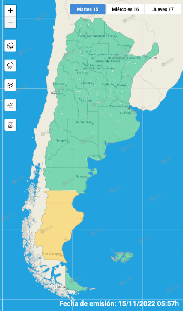 En el caso de Chubut, la alerta amarilla rige desde ayer para las mesetas de Escalante y Río Saguer, Sarmiento y sudoeste de Florentino Ameghino.