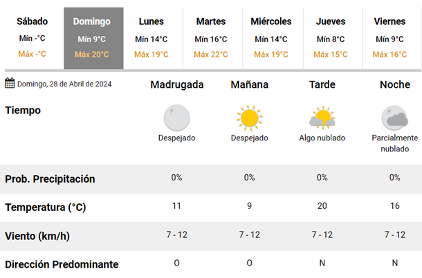 Inicialmente, el cielo estará despejado, pero conforme transcurra la jornada se irá nublando. De la misma manera, al comienzo del día el viento soplará desde el Oeste, para luego virar hacia el Norte. No se esperan precipitaciones para este domingo.