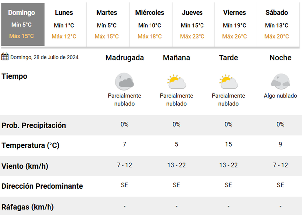Para el martes, los pronosticadores indican mismas térmicas que el domingo: 5 grados de mínima, 15 de máxima y el cielo parcialmente nublado. Como el viento soplará desde el sector Norte, las temperaturas irán en aumento, pudiendo alcanzar los 26 grados hacia el viernes.