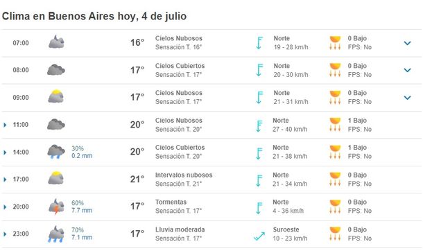 Sin embargo, el sitio Meteored anuncia un 30% de probabilidad de precipitaciones para las 14 en la Ciudad y el conurbano bonaerense.