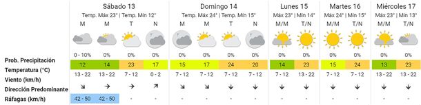 Para el domingo se prevé un leve ascenso de las temperaturas debido al ingreso de un frente de aire desde el Norte: las temperaturas estarán entre los 15° y los 24°. El cielo, en tanto, continuará con bastante nubosidad, pero irá despejándose hacia la noche.
